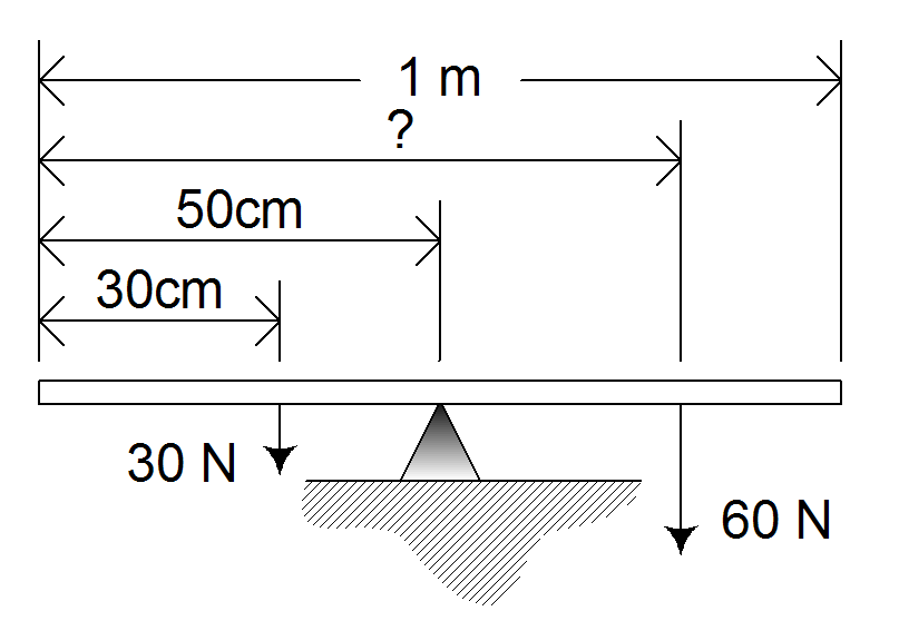 (30 N) x .2 m = (60 N) x (dfrom fulcrum)