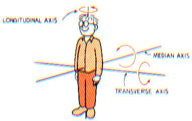 least about his longitudinal, transverse, or median axis? |