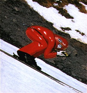 An downhill speed skier