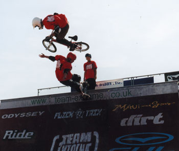 from the deck and trying to grab the ribbon with one hand. The BMXer pedals