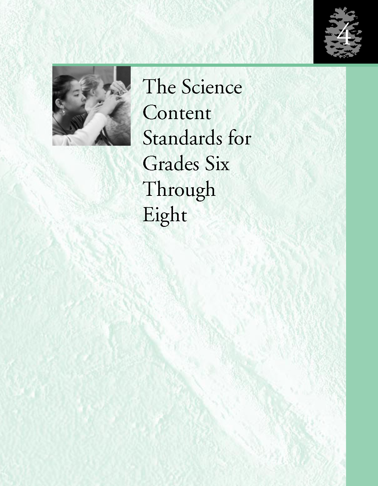 standards cover the areas of physical, life, and earth sciences in approximately equal measures. In each of the middle grades, however, the content standards emphasize an individual area. This organization permits students to probe each area in greater depth.