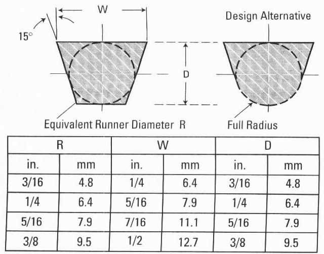When provided with full-round runner sizes and tool must use another cross section the simplest method for determining the dimensions for the alternate shape is to circumscribe a circle of the recommended diameter with the alternate shape.